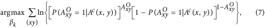 Lacking an exact solution for the partition function, we apply the maximum pseudo-likelihood method52 to estimate the parameters βk. For any node pair (x, y), denoting Ac(x, y) the matrix with all elements the same as AO but the element