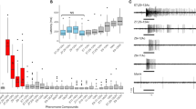 Odorants were selected for behavioral experiments and electrophysiology based on previously identified PGCs of female H. assulta and H. armigera3 92% Z11-16:Ald, 90% Z9-16:Ald, 93% Z9-14:Ald, 92% Z9-16:OH, 92% Z11-16:OH, 90% Z9-16:Ac, and 92% Z11-16:Ac were purchased from Shin-Etsu Company (Tokyo, Japan). The purity of these compounds was increased to >98% by chromatography on a silica gel column. Solutions were prepared in HPLC-grade hexane or paraffin oil (Analytical grade, Fluka). All the solutions were stored in 2 mL glass vials (Agilent Technologies, Santa Clara CA, USA) at −20 °C.