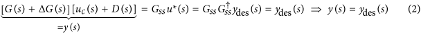 where the superscript † represents the right inverse of the matrix (i.e., A† = AT(AAT)−1). Here, Gss maps reference input u*(s) to desired output ydes(s) and the system output y(s) becomes the desired output ydes(s) by the control input uc(s). Hence, the controller makes the perturbed system G(s) + ΔG(s) converge to the desired output in the presence of disturbances D(s).
