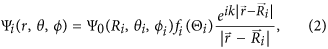 , the second factor is the electron elastic scattering factor for atom i with Θi the scattering angle, and the third factor denotes an outgoing spherical wave centered at atom i.