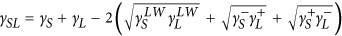 where γAB includes contributions γ− and γ+ from electron donor-acceptor interactions, respectively, also called Lewis base-acid interactions. The model assumes that the work of adhesion at the solid-liquid interface, WSL , can be approximated by geometric means as below: