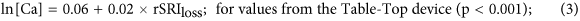 Similarly, a significant correlation (p < 0.001) was observed between calcium release and rSRIloss data from both reflectometers (rs = 0.69 and rs = 0.70 for the Table-Top and Hand-Held reflectometers, respectively). Also, after loge-transformation of the calcium results (ln[Ca]), linear regression analyses (Fig. 3b) showed a significant association between rSRIloss data from both reflectometers and calcium values, with regression equations (3) and (4) fitting the data: