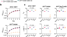 The WT-LeuRS MG1655 and the editing deficient D345A-LeuRS MG1655 strain9 were inoculated in M9 minimal media supplemented with 0.5% glucose from a single colony and grown to saturation at 37 °C. The cultures were diluted a starting OD600 of 0.025. Aerobic conditions were ensured by shaking 50 mL media in 250 mL flasks at 200 rpm. Microaerobic conditions were promoted from the beginning of the microaerobic growth experiment by cultivating the bacteria in 50 mL Falcon tubes filled with 50 mL of minimal media and shaking at 100 rpm. The colony forming unit (CFU) assay was performed at certain time-points to assess viability of the bacteria. The cultures were diluted in phosphate buffered saline at appropriate dilutions to ensure the number of colonies in a range from 30 to 800. The plates were incubated for approximately 16 h at 37 °C before counting. The competition experiments were performed using an E. coli strain that cannot utilize arabinose50 as a carbon source - MG1655 ΔaraC. This strain was derived from JW0063-1 strain (obtained from CGSC) by transfer of the arabinose utilization marker Δ(araD-araB)567 ΔaraC771::kan using P1 phage transduction into the MG1655 strain. The kanamycin cassette was further removed by standard procedures to produce a Kan sensitive strain and achieve the most similar genetic background to D345A-MG1655. Competition assays were performed to estimate the relative fitness of two E. coli strains. The strains were grown separately in M9 media until they reached saturation and the competition experiment was started by diluting each strain to a starting 0.015 OD600 in the same media (total OD600 0.030). The viability of the competitor strains was estimated using the CFU assay on indicator TA plates (tetrazolium and arabinose plates) which enabled distinction of the strains (MG1655 ΔaraC as the WT LeuRS strain and D345A-LeuRS MG1655 strain) through an arabinose utilization marker. Plated culture dilutions (100 μL were plated) that allow for a colony number between 30 and 800 were taken as representative for colony counting and calculations of CFU per milliliter of culture.