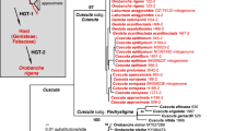 The HGT event of BO genes from Brassicaceae to Orobanche and Phelipanche must have occurred before the divergence of Orobanche and Phelipanche. Based on molecular-clock dating, Orobanche and Phelipanche diverged from each other 38 million years ago (Ma), with a 95% confidence interval of 16–45 Ma23. In our BO gene phylogeny, Orobanchaceae genes cluster with Sisymbrium with a stem age of 18 to 25 million years40 (Fig. 2; Supplementary Fig. S2). The related tribes Thelypodieae and Isatideae, from whose species genome information is not yet available and who could also have been the donor of the BO genes, shared a common ancestor with Sisymbrieae around 32 to 33 Ma40. The HGT might thus have happened between 16 and 33 Ma.