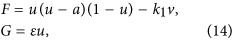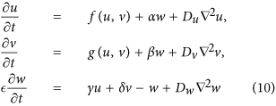 Numerical illustrations of some nontrivial regimes obtained in the two-component system, and corresponding nontrivial regimes found in the reconstructed three-component system are presented in Figs 1 and 2. These are for the two-component system (11) with the FitzHigh-Nagumo kinetics, taken in the form