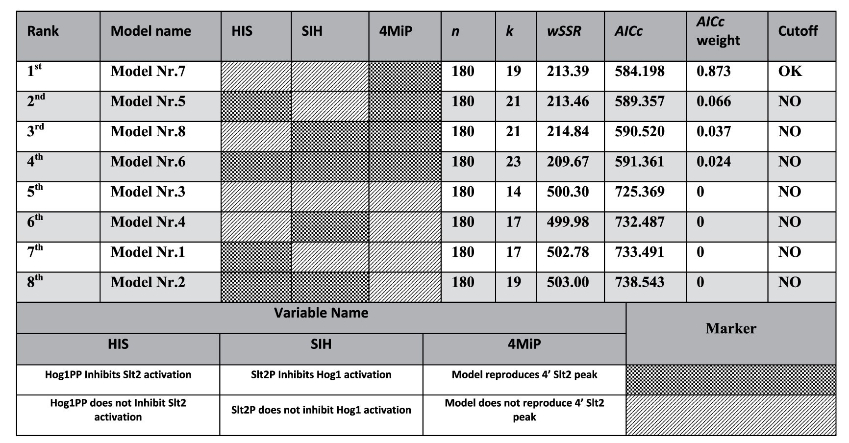 1. The data from NoHYPOS, 45″, 90″, 4′ (0.8 M sorbitol to 0.4 and 0.5 M dilutions respectively) and 45′ dilution experiments were not used for parameter estimation (wSSR). All models with sensitizer component were ranked in top 4 and were able to fit 4′ Slt2 activation peak (4MiP). The best ranked model shows no cross talk between Hog1 and Slt2 (HIS and SIH). Abbreviations: n: number of data points, k: number of parameters, wSSR: weighted sum of squared residuals, AICc: Akaike Information Criterion corrected for small sample size, AICw: Akaike weights.