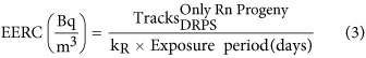 LR-115 Type II (12 μm cellulose nitrate film coated on a 100 μm thick polyester base) solid state nuclear track detector deposition based direct progeny sensor technique has been used for the measurement of 222Rn and 220Rn progeny. Direct progeny sensors are made of passive detectors (LR-115 type II) mounted with absorbers of appropriate thickness. For thoron (220Rn) progeny, the absorber is aluminum Mylar of 50 μm thickness, which selectively records the tracks due to alpha particles emitted from 212Po (α energy 8.78 MeV). For radon (222Rn) progeny, the absorber is a combination of aluminized Mylar (25 μm) and cellulose nitrate film (12 μm) of effective thickness 37 μm, which mainly detects alpha particles emitted from 214Po (α energy 7.69 MeV) and 212Po (α energy 8.78 MeV). The sensor, which is used for the detection of thoron (220Rn) progeny, is known as Direct Thoron Progeny Sensor (DTPS) and the sensor which is used for the detection of radon (222Rn) progeny is known as Direct Radon Progeny Sensor (DRPS). The basic principle of the operation of these sensors is that the LR-115 detector detects the alpha particles emitted from the deposited progeny atoms. In calculating the progeny concentrations, the track density obtained using DTPS can be used directly to calculate the equilibrium equivalent thoron concentration (EETC), since the comparatively larger thickness (50 μm) of the absorber used in DTPS does not allow radon progeny to pass through it and hence there is no interference of radon progeny to thoron progeny. In case of equilibrium equivalent radon concentration (EERC), since α energy of 212Po (thoron progeny) is higher than that of 214Po (radon progeny), the alpha particles emitted from both radon progeny as well as from thoron progeny pass through the absorber (37 μm) used in the DRPS and hence to calculate EERC, the tracks produced by the thoron progeny are eliminated as calculated from DTPS, using the equation20: