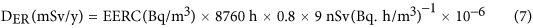where, EERC and EETC are the equilibrium equivalent concentrations of radon and thoron, respectively, in the houses of the study area. The numerical quantity 0.8 is the annual indoor occupancy factor, 9 and 40 are the dose conversion factors for radon and thoron progeny in nSv units, respectively28,29. The multiplication factor 10−6 is used to convert the nSv units into mSv units.