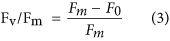 Fv/Fm was obtained by calculating the variable fluorescence (Fv), through the measurement of the minimum fluorescence for the dark-adapted cells (F0), and the maximum fluorescence obtained after the first saturation pulse (Fm):