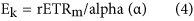 Maximum light utilisation coefficient is determined from the initial slope of RLC termed “alpha” (α)21. Light saturation coefficient (Ek) is obtained from the curve fitting model24. The value to be obtained is the interception point of the alpha (α) value with the maximum photosynthetic rate (rETRm) and calculated using equation (4).