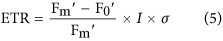 Relative electron transport rate or rETR was calculated by multiplying the irradiance by the quantum yield measured at the end of each actinic light interval. The calculation of the rETR can therefore be made using equation (5)44.