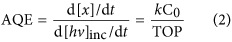 where C is the concentration of RhB that at the reaction time t, C0 is the initial concentrations of RhB, and k is the degradation rate constant. The 0.15 Mn-ZnO nanofibers exhibit the highest catalytic activity with constant rate (k) of 2.5 × 10−2 min−1, which is more than 50 times than that of ZnO nanofibers (4.7 × 10−4 min−1), shown in Fig. 3e. Obviously, RhB is started to degraded under visible light with the help of 5 at.% Mn2+-doped catalyst (see Fig. 3c), and the rate constant is 4.8 × 10−3 min−1, which is 10 times than pure ZnO. Furthermore, the rate constants increase to 1.1 × 10−2 and 2.5 × 10−2 min−1 after 10 and 15 at.% doping, respectively. To quantize the apparent quantum efficiency (AQE) of all samples, AQE can be defined as follows31: