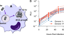 Human monocytes were purified from buffy coats and differentiated into ΜΦ according to a previously described procedure58. M. tuberculosis H37Rv was grown from a frozen stock to mid-log phase in 7H9 medium (Becton Dickinson) supplemented with albumin-dextrose-catalase (ADC, Difco). The virulence of bacteria in the frozen stock was checked by infecting C57BL/6 mice intranasally with 103 bacilli: after 21 and 42 days, the bacterial load in the lungs was approximately 107 bacteria. Before infection, bacteria were washed three times and resuspended in 1 ml PBS. Clumps were disassociated by 30 passages through a needle, and then allowed to sediment for 5 min. The density of bacteria in the supernatant was verified by measuring the OD600 and aliquot volumes defined to allow 1 bacterium-per-cell infections: cells were infected in six-well plates with each well containing 2 × 106 cells in 3 ml medium containing Macrophage Colony Stimulating Factor (R&D Systems). After 4 h of incubation at 37 °C, infected cells were washed twice in RPMI 1640 to remove extracellular bacteria and were incubated in fresh medium. In the experiments comparing different mycobacterial strains, ΜΦ were infected with Mycobacterium smegmatis mc2 155, BCG Pasteur, or the M. tuberculosis strains H37Rv, Erdman, GC1237, 5750, 5757, 5777, or 5787. The bacterial counts were confirmed by counting the colony-forming units (CFUs). Only experiments with similar numbers of bacteria of the different strains were retained for the analyses.