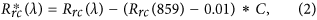 Unlike Rrs and Rrc, these TI data were somewhat resilient to moderate glint contamination. However, due to the spectral shape of sunglint, TI data still varied proportionally to the glint intensity. Using the approach of Hu16, we rescaled Rrc at 645 and 469 nm to remove the effects of glint contamination. Specifically, for pixels with Rrc(859) >0.01, Rrc for these two bands were modified such that