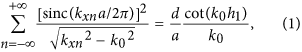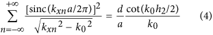 The width and period of the grooves and slits are a and d, respectively. The heights of the grooves and slits are h1 and h2, respectively. Here, we assume there are N metallic walls in a basic unit of the periodic substitution area of the structure, in which the numbers of the metallic walls in the slit-arrays and groove-arrays are N1 and N2, respectively, N = N1 + N2. Hence, the period of the basic units can be expressed as N × d. The total number of the basic units is M. When to find out the optimal constructive and destructive interference conditions, investigations on the dispersion of SSPPs supported on the reflection grating must be firstly implemented. The modal expansion method (MEM)33 is used to theoretically deduce the dispersion equation. For the theoretical analysis, we consider an infinite depth of the reflection grating in the y direction. When considering the continuity of the tangential components of the electric and magnetic fields at the boundary of grating-air interfaces, we get a transcendental equation describing the parallel momentum ks of the SSPPs as a function of the frequency,