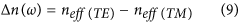 The birefringence coefficient Δn and the phase shift Δφ between TE and TM modes shown in Fig. 5 are expressed as follows