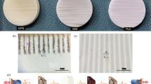 Two dielectric gratings have been fabricated by MEMs fabrication: one is called as periodic gradient grating (PGG), and the other is monotonic gradient grating (MGG). The details for device fabrication can be found in the Method Section. By lithography and etching, relief grating structures are obtained on the high resistance silicon wafers of 10 KΩ cm, where the grating ridges and grooves are alternatively arranged as shown in Fig. 1. A pair of grating ridge and groove forms a grating grid. All the groove depth is 120 μm as shown in Fig. 1(d), and all the ridge width is 30 μm as a constant. For PGG as shown in Fig. 1(a) and (c), 10 gradient increasing grids line as a gradient grid group, which has an initial grid width of 50 μm and a uniform difference of 10 μm in the adjacent grids, so the gradient grid group has 950 μm width. Several gradient grid groups are periodically arranged to form the grating PGG. Therefore, this PGG is still a periodic structure, but a series of aperiodic gradient grids formed one large lattice cell. For MGG structure as shown in Fig. 1(b), monotonically gradient increasing grids form the whole grating without any periodicity. The difference is 4 μm in the adjacent grids, and the initial period is 46 μm. Therefore, the pure linear-chirp breaks the periodicity in the MGG.