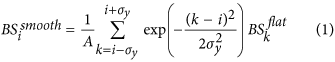 Each B-scan (BSi) is smoothed in the direction perpendicular to the B-scans (y), using a Gaussian weighted average of neighboring B-scans (BSi+1, BSi−1). Images are registered using the BM as reference. First, the BM is segmented in each raw image (Raw), and then the A-scans are shifted independently to render the BM flat and at the same depth d (Flattened). After registration, the smoothed B-scan (