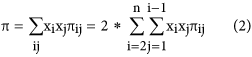Where xi is the (relative) haplotype frequency of each haplotype in the sample and n is the sample size. Nucleotide diversity (π)19 is the average number of nucleotide differences per site between two DNA sequences selected randomly from a given population. Where xi and xj are the frequencies of the i-th and the j-th sequence, respectively. πij is the number of nucleotide differences per nucleotide site between the i-th and the j-th sequences and n is the number of sample.