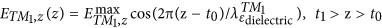 where kz is the effective wave vector of the given Floquet mode in the dielectric layer, t1 − t0 represents the thickness of dielectric layer and varies, φ1and φ2 are the phase retardations on the upper and lower dielectric-metal interfaces, respectively. For the simplicity of analysis, the lossy metal is treated as perfect electric conductor (PEC) to employ the rigorous PEC boundary conditions, so φ1 = φ2 = π for the tangential electric field Ex, and φ1 = φ2 = 0 for the normal electric field Ez. The excitation of zero order standing waves, TM0 and TE0, are predicted with kz2 = k0 2εdielectric and t1 − t0 = (2mπ − φ1 − φ2)λ/(4π