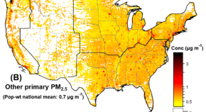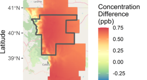The ozone climate penalty in parts per billion (ppb) in the Denver Metro North Front Range region, with nonattainment areas located within the gray box. The ozone climate penalty was defined as the difference between ground-level ozone concentrations in the 2010s and concentrations predicted using daily 2010s weather adjusted to match the 1950s climate, holding constant other factors affecting ozone formation.