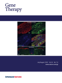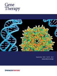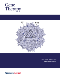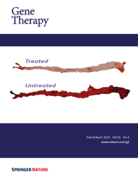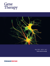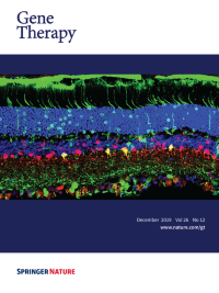Cover legend: Cellular tropism of Adeno-Associated Virus vector AAVrh10 in the rat retina. Eyes were injected intravitreally with AAVrh10-CMV-EGFP at a dose of 2.5e12 vector genomes/eye. Retinal sections were counter-stained with GFP and parvalbumin antibodies. GFP-positive cells, transduced by AAVrh10 vector, show green fluorescence. Parvalbumin-positive cells (a subgroup of amacrine and ganglion cells) show red fluorescence. AAVrh10 vector-transduced amacrine and ganglion cells show yellow fluorescence. Cell nuclei were visualized by DAPI staining (blue). See article by Zeng et al in the September 2019 issue of Gene Therapy.