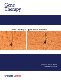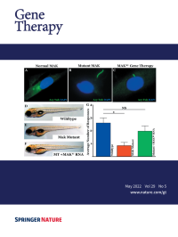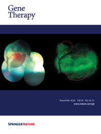 Cover Credit:Gene augmentation restores retinal MAK protein expression, rescues primary cilia length, and prevents vision loss. A-C: Immunocytochemical analysis of primary cilia length in dermal fibroblasts obtained from a normal individual (A) and a patient with MAK-associated retinitis pigmentosa (B-C). Transduction with a clinical grade gene transfer vector carrying retinal MAK rescues the ability of patient cells to regulate the length of their primary cilia (C). D-G: Generation and treatment of MAK morphant zebrafish with retinal MAK transcript restores visually guided startle responses (G). See paper by Budd A. Tucker, et al. in this issue of Gene Therapy.