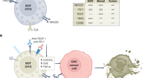 Delta One T (DOT) cells are primarily Vδ1+ γδ T cells with strong cytotoxic activity, now in clinical studies for the treatment of leukemias but not yet evaluated in solid cancers. Adoptive transfer of DOT cells combined with butyrate or checkpoint inhibitors is now shown to be an effective therapy for colorectal cancer in preclinical models.