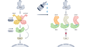 RAS–MAPK pathway inhibitors are limited by pathway reactivation and toxicity. A study now introduces IK-595, a MEK–RAF molecular glue that stabilizes MEK in an inactive complex with RAF isoforms, enabling durable inhibition of ERK signaling and anti-tumor activity in various cancers in which RAS or RAF is altered, including those resistant to current standard-of-care therapies.