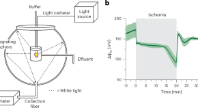 Giles et al. developed a method for noninvasive absorbance measurement of mitochondrial hemes to monitor the mitochondrial membrane potential in the perfused heart. They then applied this approach to show how the mitochondrial membrane potential changed during cardiac ischemia.