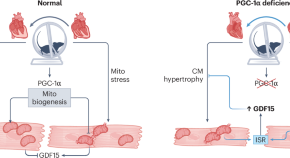 Upregulation of PGC-1α in the mouse heart during exercise training maintains mitochondrial homeostasis and promotes physiological hypertrophy by suppressing the stress-induced production of GDF15 in cardiomyocytes independently of its circulating levels. Identification of this cell-autonomous signaling circuit provides novel insights into the functional role of GDF15 in health and diseases. Future studies are warranted to investigate the interaction of PGC-1α and GDF15 in other stress conditions and in human subjects.