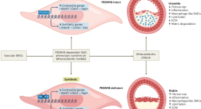 Genome-wide association studies (GWAS) in coronary artery disease have revealed gene variants highly expressed in vascular smooth muscles cells (SMCs). Research now suggests that loss of one, Prdm16, drives a switch toward a synthetic SMC phenotype, with robust, potentially protective extracellular matrix production and fibrous cap formation.