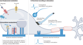 • Nano-bio interfaces enable communication between synthetic materials and biological systems at the nanoscale, with their functionality shaped by material properties, surface chemistry and topography. This Review discusses the key considerations and methods for engineering nano-bio interfaces for bioelectrical signal detection and biochemical signal transduction.