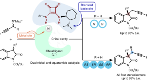 The construction of all stereoisomers of molecules containing contiguous stereocentres with full control of the absolute and relative stereochemical configuration has rarely been demonstrated. An approach involving dual-catalytic activation enables the stereodivergent α-propargylation of oxindoles with high stereocontrol and shows broad substrate scope.