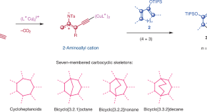 The construction of seven-membered carbocycles through cycloaddition reactions represents a longstanding challenge in organic synthesis. A study now reports a copper-catalysed enantioselective (4 + 3) cycloaddition between 2-aminoallyl cations and dienol silyl ethers that affords structurally diverse cycloheptanoids with high stereoselectivities and shows broad substrate scope.