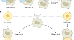 Cornell et al. show that target cells with low cortical tension induce macrophages to preferentially trogocytose, or engulf in small fragments, whereas target cells with high cortical tension tend towards phagocytosis.