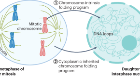 Chromosomes unfold and refold each time cells divide. A study by Schooley et al. demonstrates that chromosome-intrinsic and cytoplasmic factors uniquely contribute to interphase chromosome structure, with new possibilities for how gene expression programs are passed from mother cells to daughter cells.