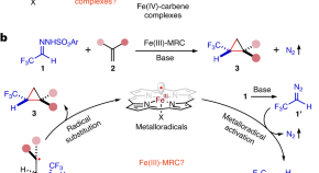 Experimental and computational studies establish the operation of Fe(iii)-based metalloradical catalysis for the asymmetric cyclopropanation of alkenes with different classes of diazo compounds. The reaction proceeds through a stepwise radical mechanism involving α-Fe(iv)-alkyl and γ-Fe(iv)-alkyl radical intermediates. This work provides a future direction for the development of metalloradical catalysis.