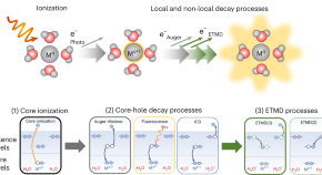 Radiation damage in biological systems by radicals and low-energy electrons formed from water ionization is a consequence of ultrafast processes that follow core-level ionization of hydrated metal ions. More details of the complex pathway are now revealed from the study of aluminium-ion relaxation through sequential electron-transfer-mediated decay.