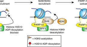 Histone H3 serine 10 is found to be the major chromatin acceptor residue for DNA damage–induced ADP-ribosylation and is blocked by specific acetylation sites on PARP1 and/or H3.