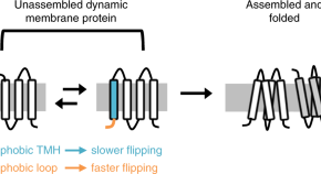 The topology of homodimeric membrane protein EmrE is dynamic and includes unassisted flipping of an N-terminal helix in and out of the membrane long after co-translational insertion. Dimerization locks the helix to limit topological dynamics.