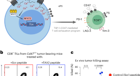 T cell exhaustion is a major barrier to antitumor immunity and limits the success of immunotherapies. We show that binding of thrombospondin-1 (TSP-1) to CD47 on CD8+ T cells promotes exhaustion through a calcineurin–NFAT–TOX signaling pathway. Disrupting this interaction prevents T cell dysfunction and enhances the efficacy of immunotherapy.