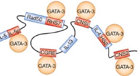 TH2 cells control immune responses to helminth infection and contribute to the development of allergic asthma. A single intronic enhancer element in Il4 can regulate TH2 differentiation and susceptibility to allergic asthma via interaction with the transcription factor GATA-3.
