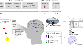 Upregulation of the ventral tegmental area via neurofeedback is associated with a stronger immune response to hepatitis B virus vaccination, and VTA upregulation is achieved through conscious positive expectations.