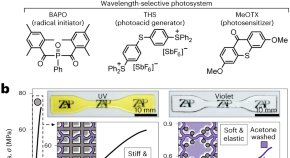 A resin comprising a hybrid epoxy–acrylate monomer and wavelength-selective photosensitizer components achieved rapid, high-resolution 3D printing of multimaterial structures. This technique produced structures that emulate natural mechanical gradients and functional structures including a spring for compressive damping, a knee joint model for smooth motion and a stretchable substrate for wearable electronics.