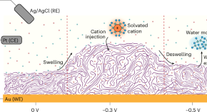 Unlike common organic mixed ionic–electronic conductors that swell upon electrochemical doping, poly(benzimidazobenzophenanthroline) exhibits an unexpected cation-dependent deswelling at high doping levels. Operando measurements and modelling show that protic cations drive this response by expelling water and localizing charge through strong interactions with the polymer backbone, revealing a distinct deswelling mechanism.