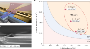 Simultaneous high-bandwidth and high-optoelectronic conversion efficiency in photodiodes is difficult to achieve. Now, researchers have demonstrated waveguide-integrated photodiodes with over 200 GHz bandwidth, 0.81 A/W responsivity and a bandwidth–efficiency product of 133.5 GHz, thus enabling amplifier-free 120 Gbps wireless transmission over 54 m.