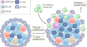 The dominant immune cell type causing pancreatic islet inflammation in individuals with obesity and/or type 2 diabetes mellitus is the macrophage. In this Review, we focus on the characteristics of inflammation in obese or type 2 diabetes mellitus islets and the consequences of this with respect to β-cell function.