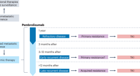 In the KEYNOTE-564 trial, patients with resected clear cell renal cell carcinoma at a high risk of relapse experienced disease-free survival and especially overall survival benefits following treatment with pembrolizumab, which in turn was established as the novel standard adjuvant therapy for these patients. Accurate patient selection is crucial. Managing post-pembrolizumab recurrence is challenging owing to limited evidence for guiding therapeutic decisions based on clinical features.