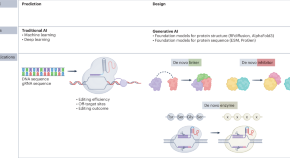 Artificial intelligence (AI) is advancing genome editing, from predictive modeling to generative design. Emerging generative AI tools such as RFdiffusion, AlphaFold 3 and ESM now facilitate the de novo design of linkers, inhibitors and enzymes. We highlight work where AI-driven design is used to enhance the precision of mitochondrial cytosine base editors.